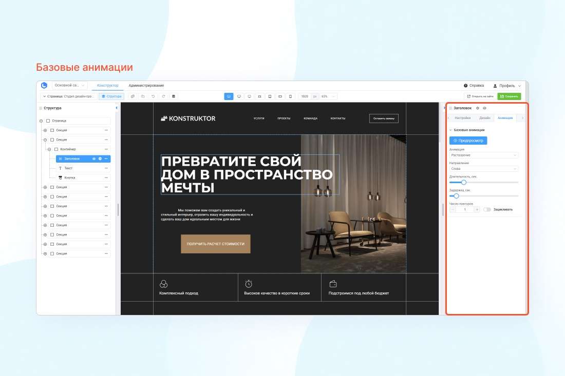 Настраивайте анимации для всех блоков, чтобы сделать контент более динамичным и привлекательным!